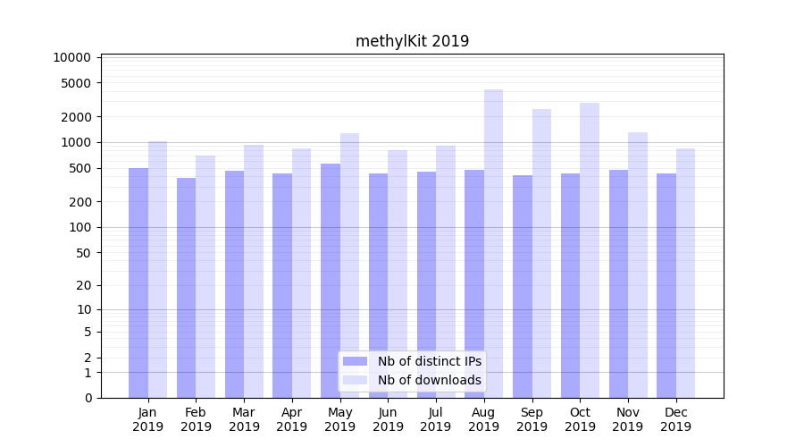 Number of downloads for software package methylKit, year by year, from 2025 back to 2014 (years with no downloads are omitted):