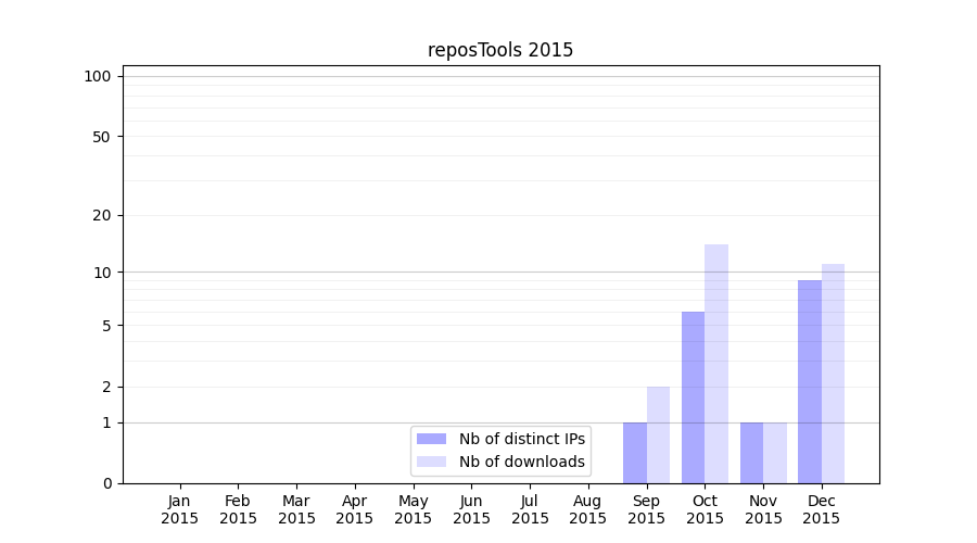 Number of downloads for software package reposTools, year by year, from 2025 back to 2014 (years with no downloads are omitted):