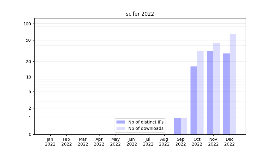 Number of downloads for software package scifer, year by year, from 2025 back to 2014 (years with no downloads are omitted):