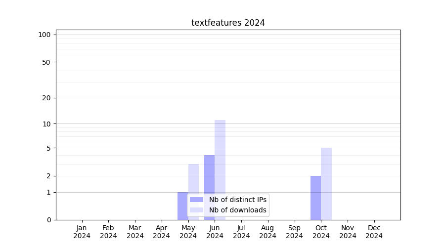 Number of downloads for software package textfeatures, year by year, from 2025 back to 2014 (years with no downloads are omitted):