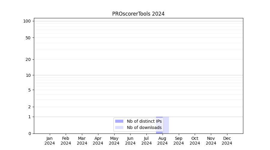 Number of downloads for annotation package PROscorerTools, year by year, from 2025 back to 2014 (years with no downloads are omitted):