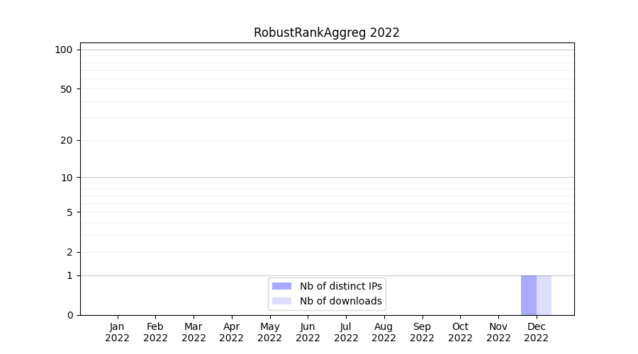 Number of downloads for annotation package RobustRankAggreg, year by year, from 2025 back to 2014 (years with no downloads are omitted):