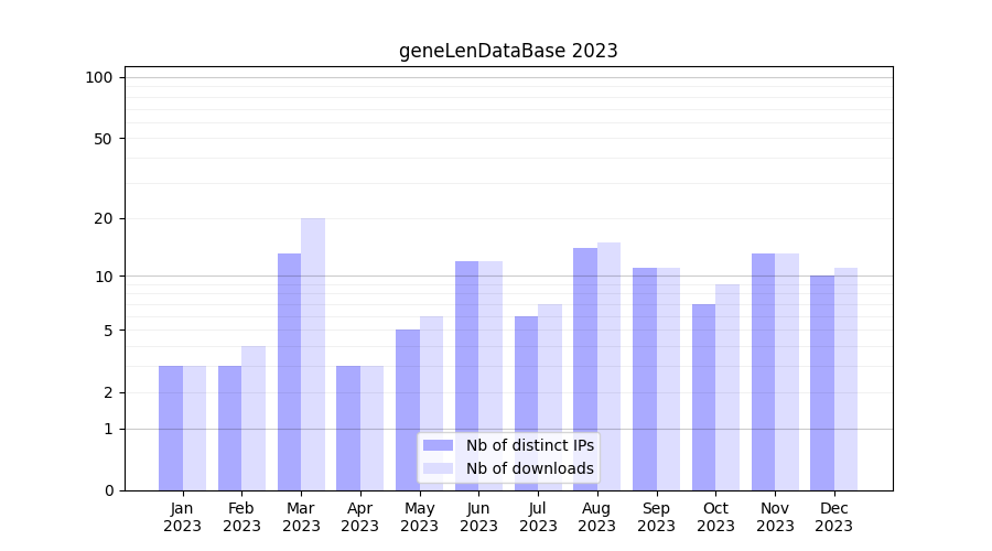 Number of downloads for annotation package geneLenDataBase, year by year, from 2025 back to 2014 (years with no downloads are omitted):