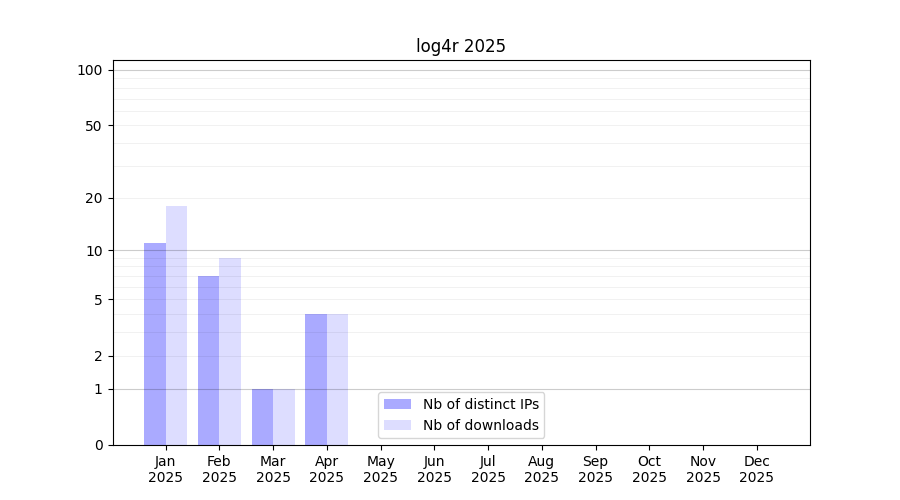 Number of downloads for annotation package log4r, year by year, from 2025 back to 2014 (years with no downloads are omitted):