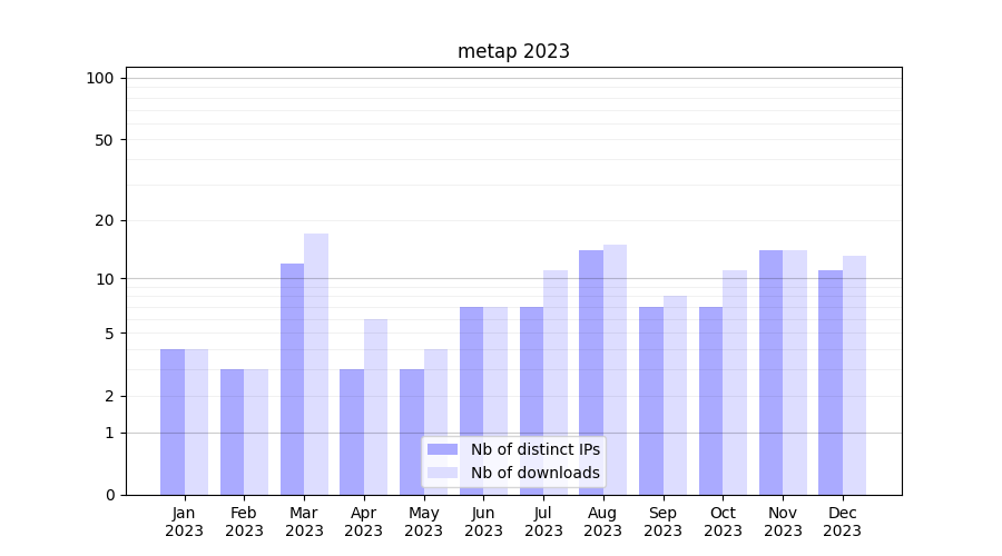Number of downloads for annotation package metap, year by year, from 2025 back to 2014 (years with no downloads are omitted):
