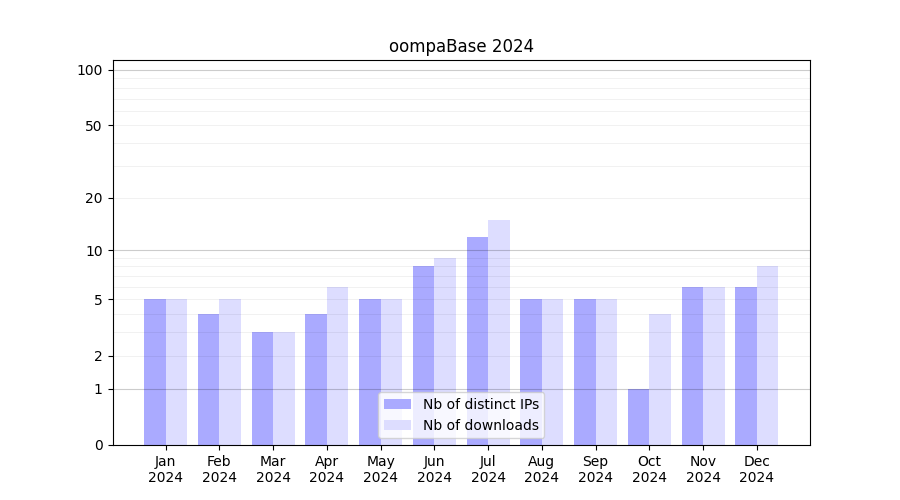 Number of downloads for annotation package oompaBase, year by year, from 2025 back to 2014 (years with no downloads are omitted):