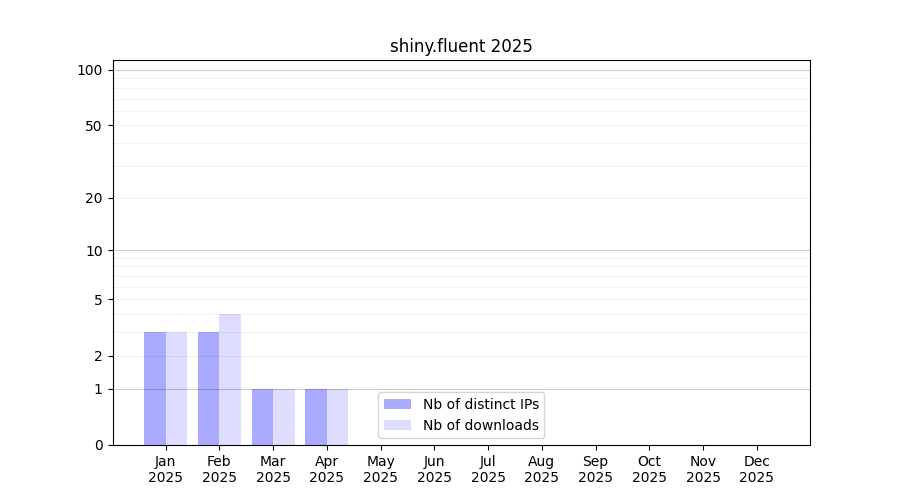 Number of downloads for annotation package shiny.fluent, year by year, from 2025 back to 2014 (years with no downloads are omitted):