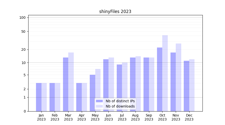 Number of downloads for annotation package shinyFiles, year by year, from 2025 back to 2014 (years with no downloads are omitted):