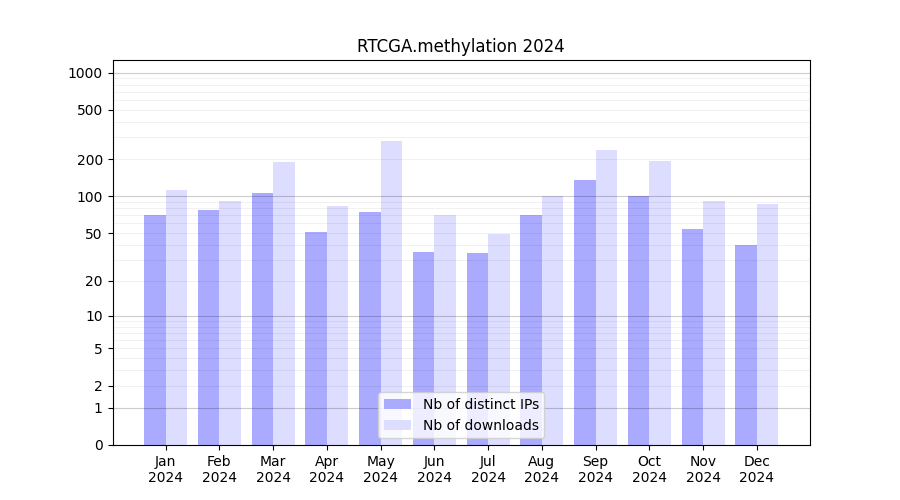 Number of downloads for experiment package RTCGA.methylation, year by year, from 2025 back to 2014 (years with no downloads are omitted):