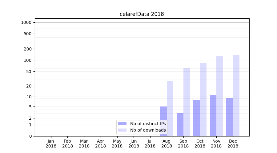 Number of downloads for experiment package celarefData, year by year, from 2025 back to 2014 (years with no downloads are omitted):