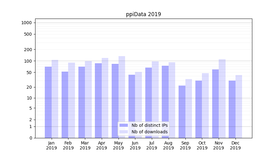 Number of downloads for experiment package ppiData, year by year, from 2025 back to 2014 (years with no downloads are omitted):