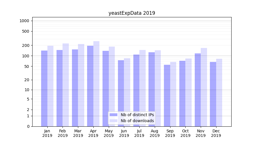 Number of downloads for experiment package yeastExpData, year by year, from 2025 back to 2014 (years with no downloads are omitted):
