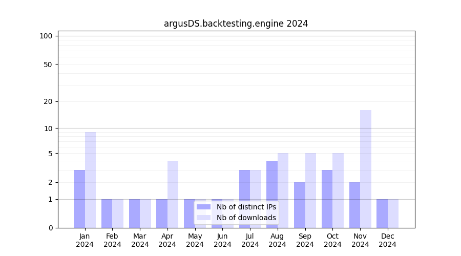 Number of downloads for workflow package argusDS.backtesting.engine, year by year, from 2025 back to 2015 (years with no downloads are omitted):