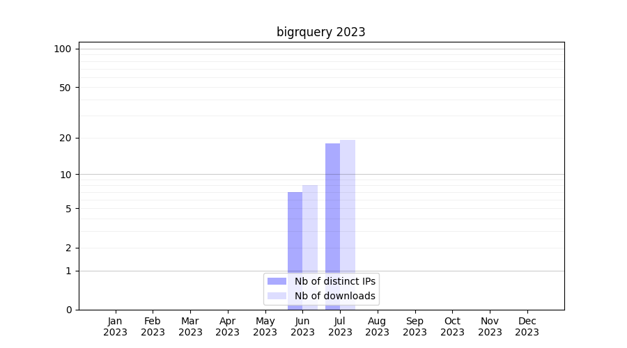 Number of downloads for workflow package bigrquery, year by year, from 2025 back to 2015 (years with no downloads are omitted):