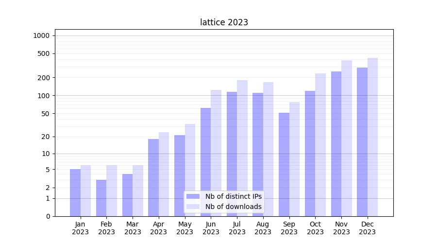 Number of downloads for workflow package lattice, year by year, from 2025 back to 2015 (years with no downloads are omitted):