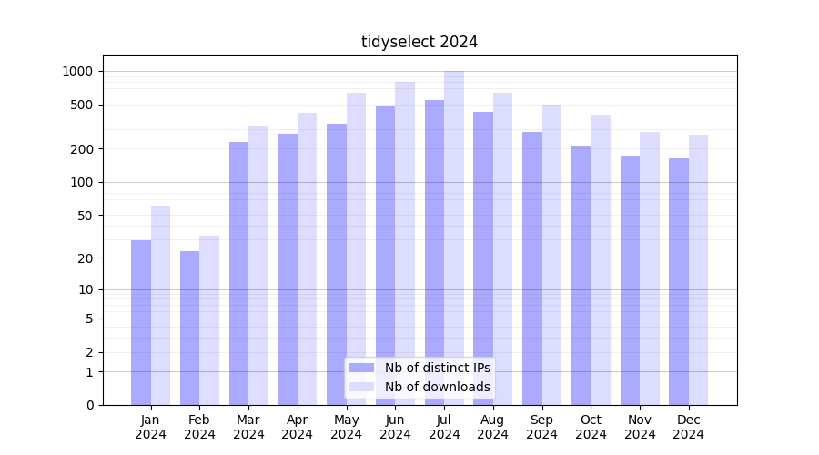 Number of downloads for workflow package tidyselect, year by year, from 2025 back to 2015 (years with no downloads are omitted):