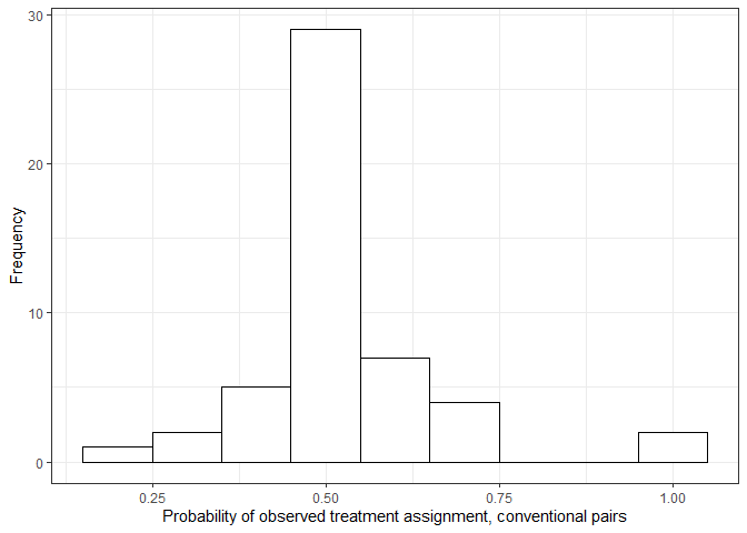 #> 8 8 28Matched pairs formed without using the dose assignment discrepancy caliper may have probabilities of observed treatment assignment heavily deviate from \(0.5\), as shown in the plot below.