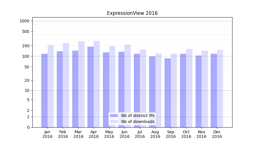 Number of downloads for software package ExpressionView, year by year, from 2025 back to 2014 (years with no downloads are omitted):
