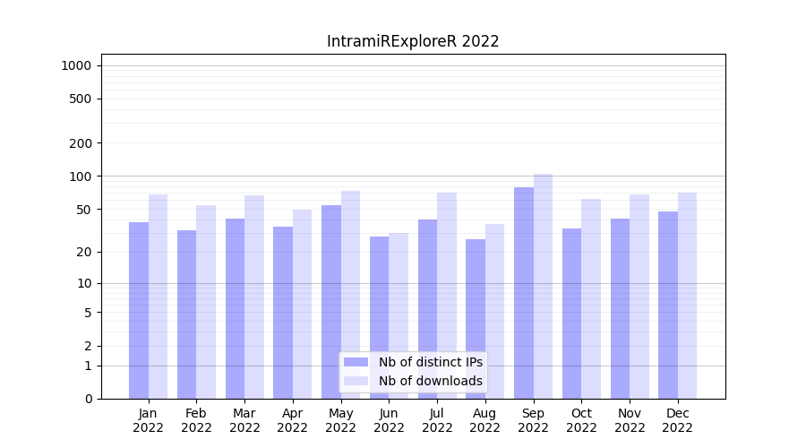 Number of downloads for software package IntramiRExploreR, year by year, from 2025 back to 2014 (years with no downloads are omitted):
