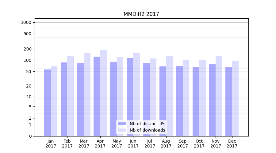 Number of downloads for software package MMDiff2, year by year, from 2025 back to 2014 (years with no downloads are omitted):