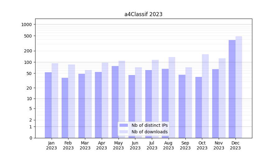 Number of downloads for software package a4Classif, year by year, from 2025 back to 2014 (years with no downloads are omitted):