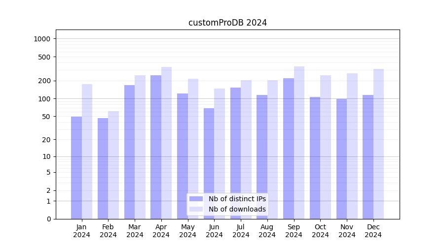 Number of downloads for software package customProDB, year by year, from 2025 back to 2014 (years with no downloads are omitted):