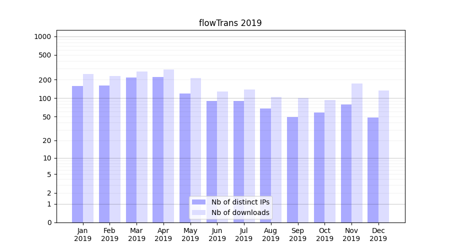 Number of downloads for software package flowTrans, year by year, from 2025 back to 2014 (years with no downloads are omitted):