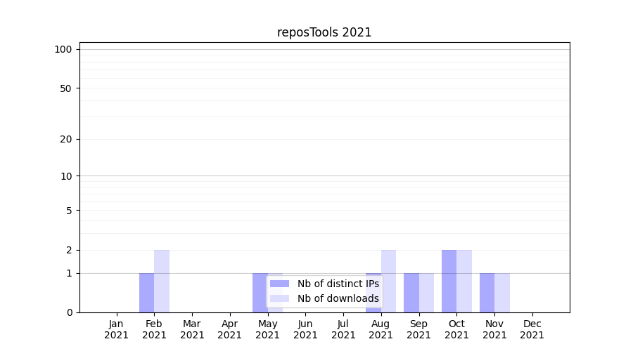 Number of downloads for software package reposTools, year by year, from 2025 back to 2014 (years with no downloads are omitted):