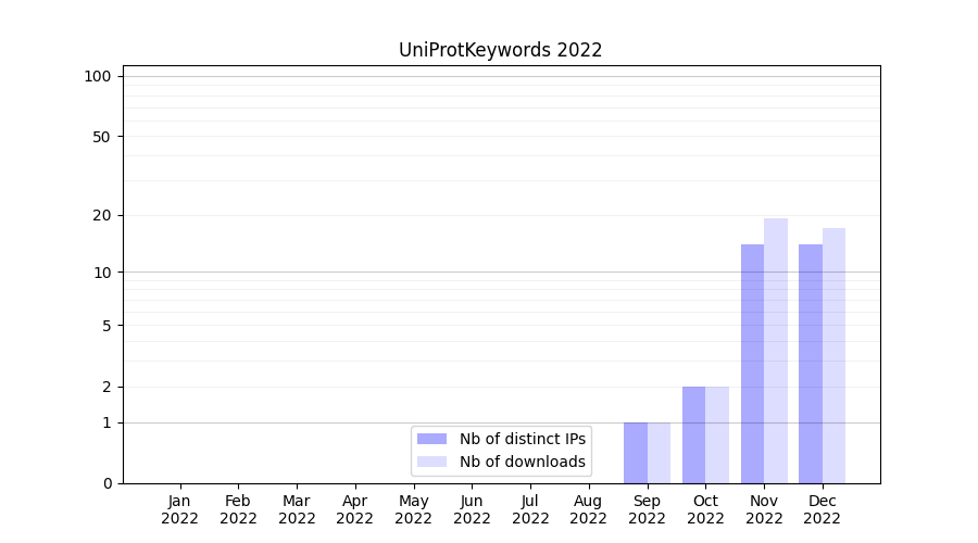 Number of downloads for annotation package UniProtKeywords, year by year, from 2025 back to 2014 (years with no downloads are omitted):