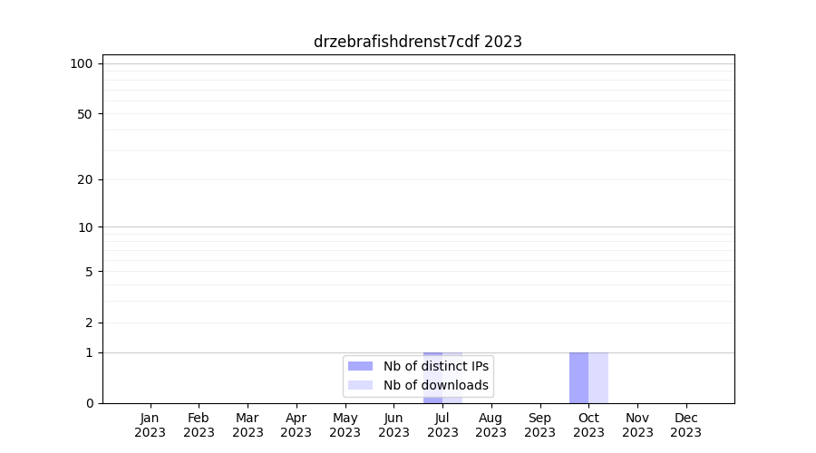 Number of downloads for annotation package drzebrafishdrenst7cdf, year by year, from 2025 back to 2014 (years with no downloads are omitted):