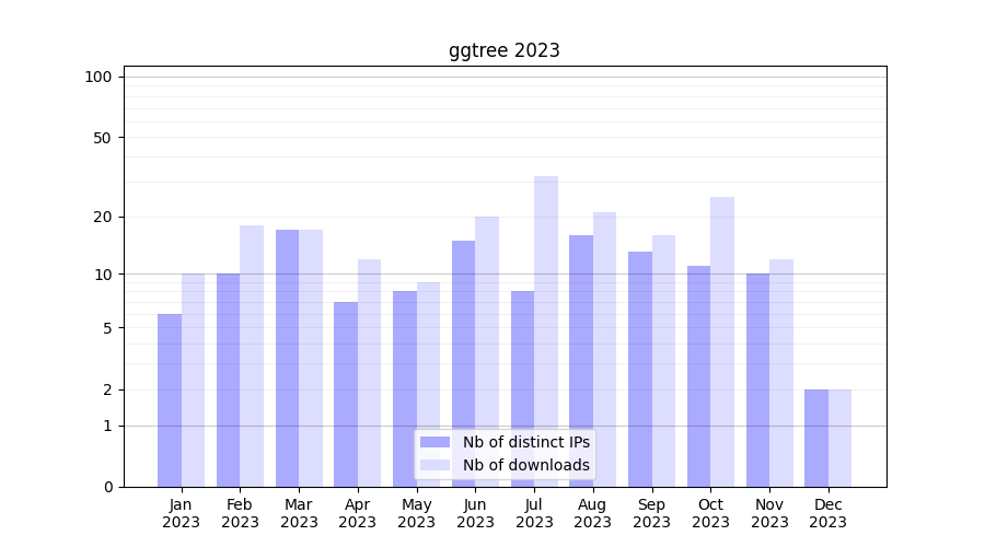 Number of downloads for annotation package ggtree, year by year, from 2025 back to 2014 (years with no downloads are omitted):