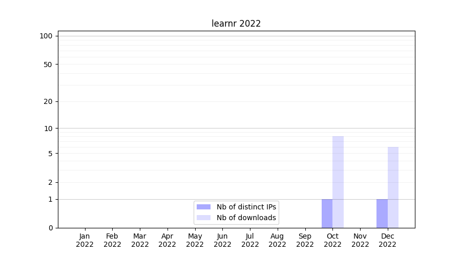 Number of downloads for annotation package learnr, year by year, from 2025 back to 2014 (years with no downloads are omitted):