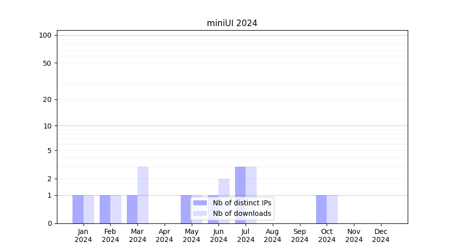 Number of downloads for annotation package miniUI, year by year, from 2025 back to 2014 (years with no downloads are omitted):