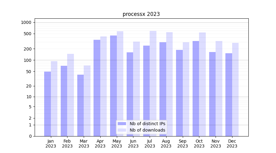 Number of downloads for annotation package processx, year by year, from 2025 back to 2014 (years with no downloads are omitted):