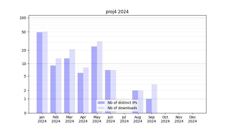 Number of downloads for annotation package proj4, year by year, from 2025 back to 2014 (years with no downloads are omitted):