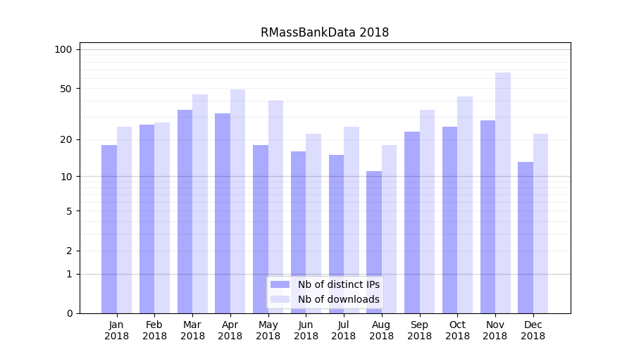 Number of downloads for experiment package RMassBankData, year by year, from 2025 back to 2014 (years with no downloads are omitted):