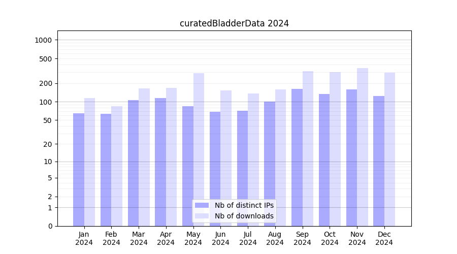 Number of downloads for experiment package curatedBladderData, year by year, from 2025 back to 2014 (years with no downloads are omitted):